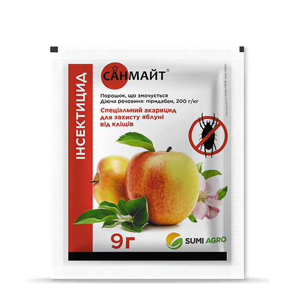 Санмайт - универсальный препарат для защиты яблонь от клещей. Рабочий раствор: 5-9 г препарата растворить в 10-12 л воды на 1 сотку. Для достижения максимальной эффективности действия препарата его необходимо использовать после цветения плодовых деревьев, когда популяции клещей достигают максимального уровня. Кратность обработок - одна.