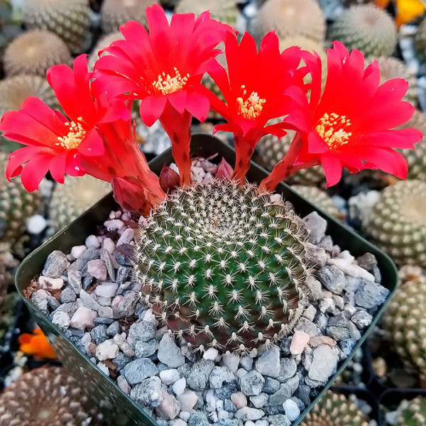 Кактус Ребуция (Rebutia) - любимый цветоводами за яркое и фантастическое цветение кактус. Он представляет собой шаровидные стебли диаметром до 5 см, образующие крупные скопления.