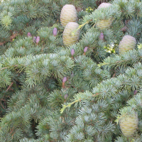 Хвоя: Игловидная, серо-голубого цвета, длиной до 2,5 см. Как правило короткие побеги покрыты хвойными пучками, а более длинные - хаотично, спиралевидно.