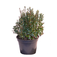 Листья: очерёднорасположенные, яйцевидные, длиной 1-2 см, тёмно-зелёные с красными краями, слегка кожистые, мягкой зимой не опадают.
