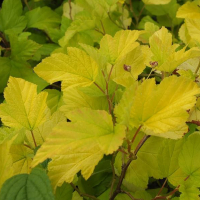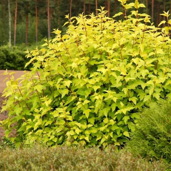 Физокурпус (пузыреплодник калинолистный) "Ангел Голд" - кустарник высотой до 2-2,5 м с густой округлой кроной, образованной вертикальными, слегка раскидистыми ветвями. Побеги - красновато- или розовато- коричневые. Листья 3-5 лопастные, яркие, лимонно-желтые, в центре куста - желто-зеленые. Осенью - золотисто-желтые. Период цветения июнь-июль. Цветки бело-розовые, в щитковидных соцветиях. Плоды вздутые, бурые. Темп роста быстрый.