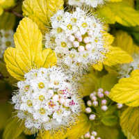 Декоративен яркой окраской листьев - лимонно-желтой и белыми щитковидными соцветиями.