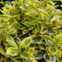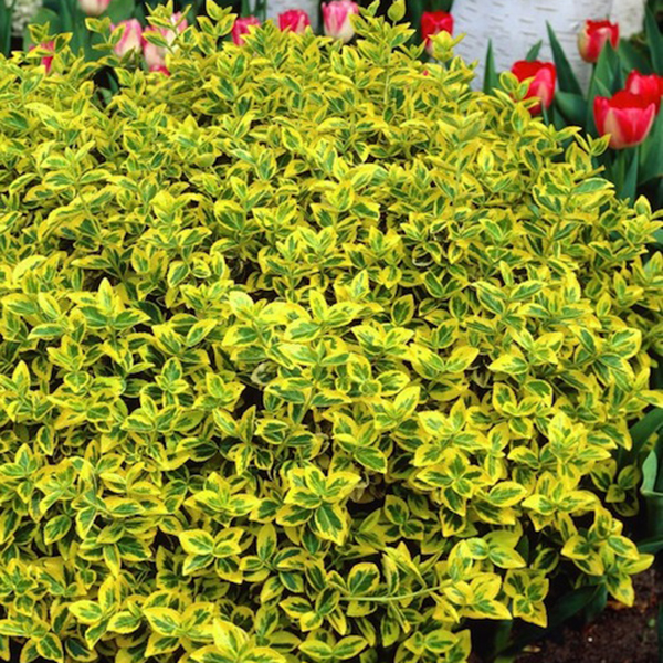 Бересклет Форчуна "Эмеральд Голд" - чрезвычайно распространенный сорт. Это компактный медленно разрастающийся кустик в высоту до 30 см. Листья небольшие – 2 см, остролистные. Высоко ценится за окраску: сами листья яркие изумрудные, а их окантовка золотистая, желтая. Осенью растение меняет окраску, становится красновато-бурым.