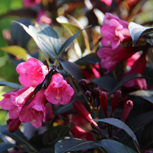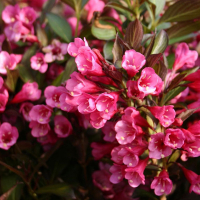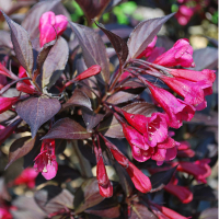 Вейгела цветущая Александра - красивоцветущий и одновременно декоративно-лиственный кустарник с густой, раскидистой шаровидной формы кроны. Высота растения достигает 1-1,5 м. Многочисленные красновато-розовые воронкообразные цветы и декоративные бордовые листья делают вейгелу Александру чрезвычайно популярной.
