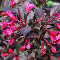 Вейгела цветущая Александра - красивоцветущий и одновременно декоративно-лиственный кустарник с густой, раскидистой шаровидной формы кроны. Высота растения достигает 1-1,5 м. Многочисленные красновато-розовые воронкообразные цветы и декоративные бордовые листья делают вейгелу Александру чрезвычайно популярной.
