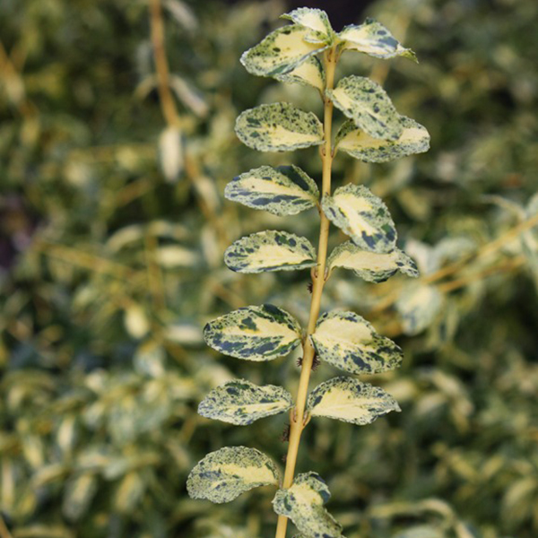 Листья: пёстрые, овальной формы, зубчатые по краям, супротивно расположенные, эллиптические, или округло-яйцевидные, длиной 4 см и шириной 2,8 см, темно-зеленые с яркими вкраплениями. Новый рост листьев чисто белый, потом с розовым оттенком зимой.
