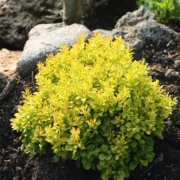 Барбарис тунберга Тини Голд (Berberis thunbergii Tiny Gold) - карликовый шаровидный кустарник высотой до 30 см и диаметром до 50 см. Отличается мелкими листьями яркого лимонно-желтого цвета, не выгорают на солнце, которые в осенний период становятся оранжево-красными. Растет медленно. Цветки многочисленные светло-желтые, собраны в пучки. Цветет в мае - июне. Плоды - продолговатые, оранжево-красные ягоды - созревают в сентябре.