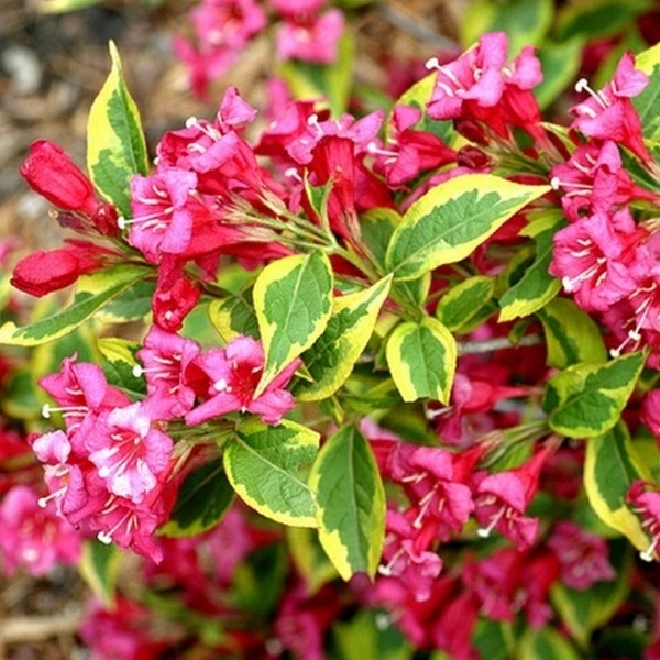 Вейгела цветущая Мулен Руж - листопадный пряморастущий кустарник с живописно изогнутыми, раскидистыми боковыми побегами и довольно сочными, пестрыми листьями: светло-зеленые, окаймленные золотисто-желтым или кремово-желтым цветом и тоненькой красной полоской. Осенью листья не теряют яркости и долго остаются на ветвях. Ярко-розовые цветы, похожие на колокольчики, обильно укрывают куст в конце весны. В конце лета возможно повторное цветение. Оно не такое обильное, но так же очень красивое.
