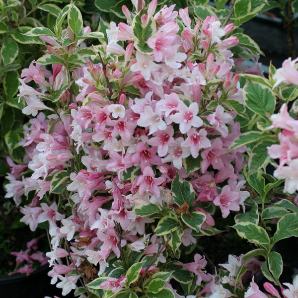 Вейгела цветущая Вариегата (Weigela florida Variegata) - компактный, густой кустарник с округлой формой. Достигет высоты 1,5 м. и около 2 м. в диаметре.