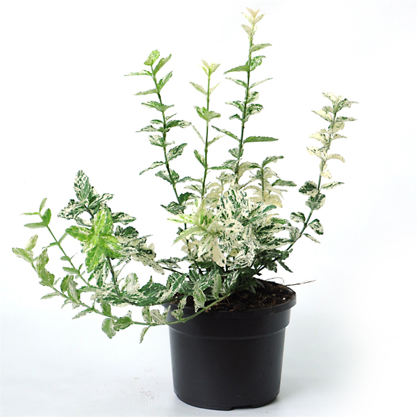 Листья: пёстрые, овальной формы, зубчатые по краям, супротивно расположенные, эллиптические, или округло-яйцевидные, длиной 4 см и шириной 2,8 см, темно-зеленые с яркими бело-кремовыми вкраплениями. Новый рост листьев чисто белый, потом с розовым оттенком зимой.