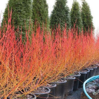Дерен кроваво-красный Мидвинтер Файер ? декоративный сорт с красочными листьями и побегами и красивыми плодами. Этот сорт можно использовать для живых изгородей или в качестве фона для других растений. Красиво будет смотреться в качестве солитера на зеленом газоне. Эффектно выглядит по соседству с хвойными. Из-за миниатюрности сорта, этот кустарник подходит для контейнерного выращивания. Декоративные кустарники производят белые ягоды, несъедобные для человек, но их очень любят птицы.