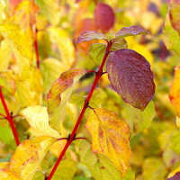 листья: эллиптически-яйцевидные, края цельнокрайние, темно-зеленые, осенью становятся ярко-красными,