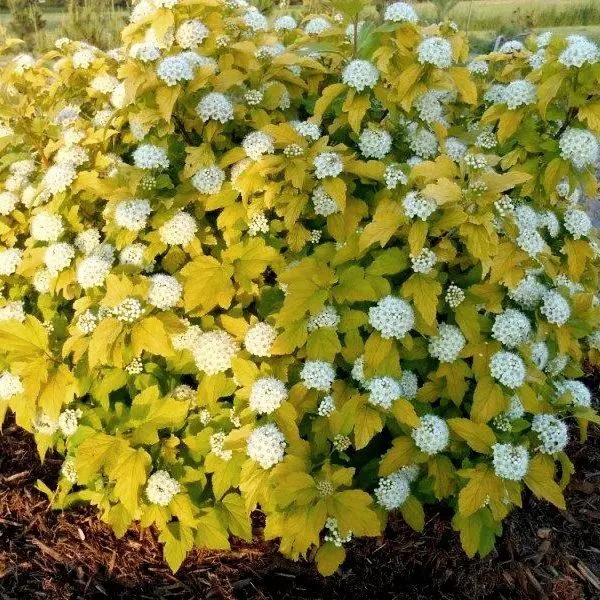 Весной листва имеет желто-оранжевую окраску, летом – желто-зеленую, осенью приобретает золотистый оттенок. В начале июня покрывается многочисленными белыми, собранными в щитки цветочками, которые украшают куст почти месяц, превращаясь в красноватые плоды. Меняющаяся окраска листьев, цветки и плоды придают этому сорту неповторимости в период вегетации.