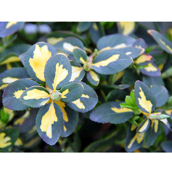 Листья: блестящие, пестрые, темно-зеленые с большим интенсивным бело-желтым пятном посередине, супротивно расположенные, эллиптические, или округло-яйцевидные, длиной 4 см. и шириной 2,8 см.,
