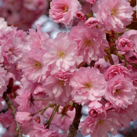Сакура Канзан (Kanzan, декоративная слива, японская вишня) - это невероятно красивое декоративное дерево. Этот сорт японской вишни является невысоким (вырастает до 12 метров), обладает сильной кроной с большим количеством соцветий в период цветения. Цветение сакуры продолжается 2 недели, после завязываются плоды. Вишенки (лили сливы) представляют собой темно-синие, почти черные, или фиолетовые горошины, горько-кислые на вкус.