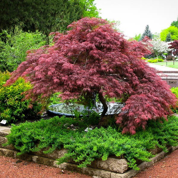 Клён веерный (пальмолистный) Гарнет - небольшой, компактный, подушковидный кустарник, медленнорастущий. Побеги образуют зонтичную форму кроны. Высота до 4 м, ширина 2 м. Листья филигранные, глубоко рассеченны. Весной имеют ярко-красную окраску, с начала лета начинают приобретать более глубокий цвет - до бордового, к осени становятся красно-фиолетовыми.