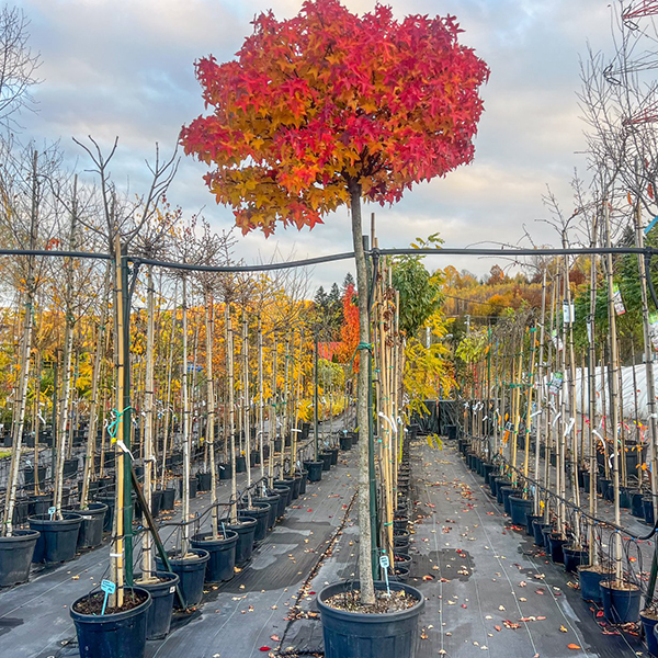 Liquidambar styraciflua Gum Ball – компактное, декоративное дерево с идеально шаровидной кроной, которая формируется естественным путем. Осенью очаровывает яркими оттенками красного, оранжевого и пурпурного. Медленный рост и неприхотливость делают идеальным для садов, аллей и городских просторов. Декоративная кора и необычные плоды придают уникальность.