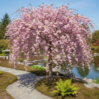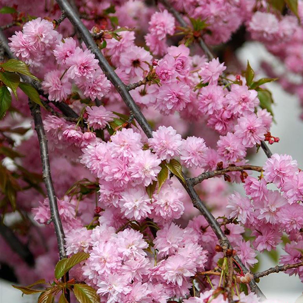 Цветение апрель-май. Цветы розовые, густомахровые очень многочисленные. Плоды съедобные, размером мельче обычной вишни.