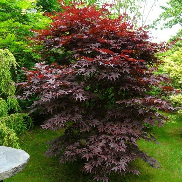 Использование: Великолепный сорт для небольших садов, хорошо выглядит у воды, рядом с камнями в рокариях. Эфектно смотрится в качестве контейнерного растения для террас, при входе в дом или учреждение. Особенно ценится за ажурную листву, красоту и изящество кроны и невероятно интенсивную окраску.