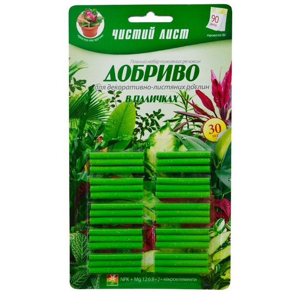 Назначение: "Чистый лист: удобрение в палочках" применяется для насыщения почвы полезными микро- и макроэлементами. Его сбалансированная формула помогает придать густоты ветвям и листьям, повысить стойкость побегов к негативном внешним воздействиям и ускорить их развитие. Магний повышает иммунитет растений, устраняя последствия стрессов. Витамины ускоряют укоренение саженцев и помогают подготовить декоративно-лиственные к периоду активного роста.