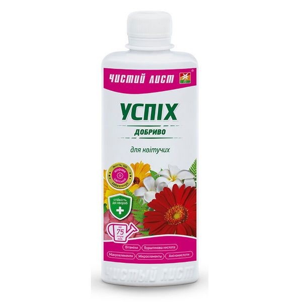 «Успех для цветущих растений» сложное минеральное удобрение с комплексным биологически активных веществ, содержит все необходимые макро- и микроэлементы в доступной форме для полноценного питания, стимулирует развитие корневой системы растения, подавляет развитие патогенной микрофлоры. Повышает устойчивость к заболеваниям, предотвращает развитие хлороза.