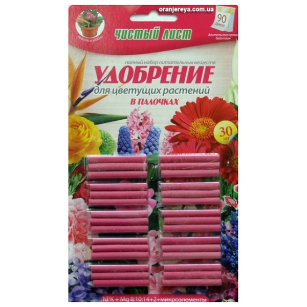 Комплексное удобрение Квитофор Чистый лист в палочках содержит необходимые для полноценного роста растения макро- и микроэлементы, а также комплекс витаминов, который увеличивает устойчивость к болезням и неблагоприятным условиям содержания.