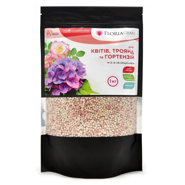 Высококачественное комплексное гранулированное минеральное удобрение Floria Gran Для цветов, роз и гортензий с высоким содержанием макро- и микроэлементов способствует активному росту и развитию всех видов цветущих растений, роз и гортензий, обеспечивает их пышное и долговременное цветение.