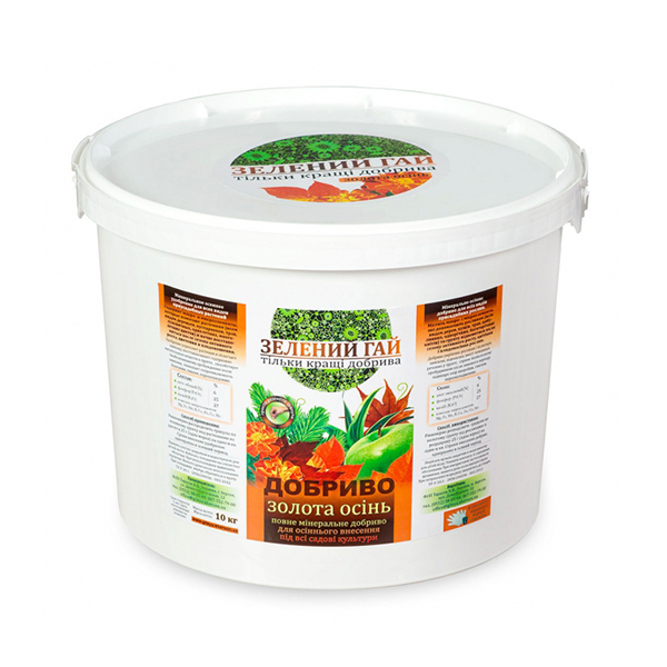 Зеленый Гай Золотая осень (10кг) – комплексное минеральное удобрение для всех видов растений открытого грунта осенью. Способствует укреплению растений и облегчает их зимовку, повышает устойчивость к заболеваниям, гниению, переохлаждению.