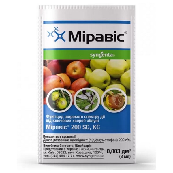 Контактно-системный фунгицид Миравис предназначен для обработки яблони, а также других плодовых и овощных культур с целью защиты от комплекса грибковых и патогенных заболеваний.