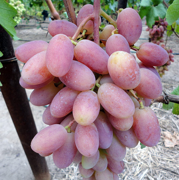 Виноград Виктор, селекция Крайнова В.Н. Срок созревания винограда Виктор очень ранний или ранний. Обычно созревает в начале августа. Рост кустов сильный, лоза вызревает хорошо. Цветок обоеполый, опыляется хорошо. Грозди средней плотности, крупные, массой 500 – 1000 г, иногда до 1500 г. Ягоды очень крупные, массой 9-14 г (34 х 20 мм до 42 х 26 мм). По форме длинные со слегка заостренным кончиком. Цвет вызревших ягод розовый или желто розовый, зависит от места нахождения грозди (в тени или на солнце) и стадии созревания. В тени окрашивается лучше, на солнце часто обжигается.
