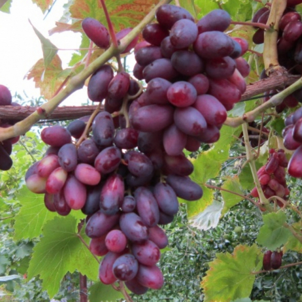 Виноград Изюминка - предлагаем корне-собственные саженцы винограда - столовый сорт раннего срока созревания,105-115 дней. Куст сильно-рослый. Цветок функционально женский, опыление хорошее. Грозди крупные, средней массой 600 - 800 г, горошения не наблюдалось. Ягода красивая, крупная, удлиненной формы, размером 33,5 x 16,7 мм, массой 10-12 г, темно-красной окраски. Мякоть мясистая, плотная. Кожица съедаемая. Вкус приятный, гармоничный. Рекомендуемая нагрузка на куст 40-45 глазков. Рекомендуемая длинна обрезки плодовых лоз 10-12 почек. Морозостойкость до - 22 С. Виноград Изюминка для центральной и северной части Украины укрывают на зиму.
