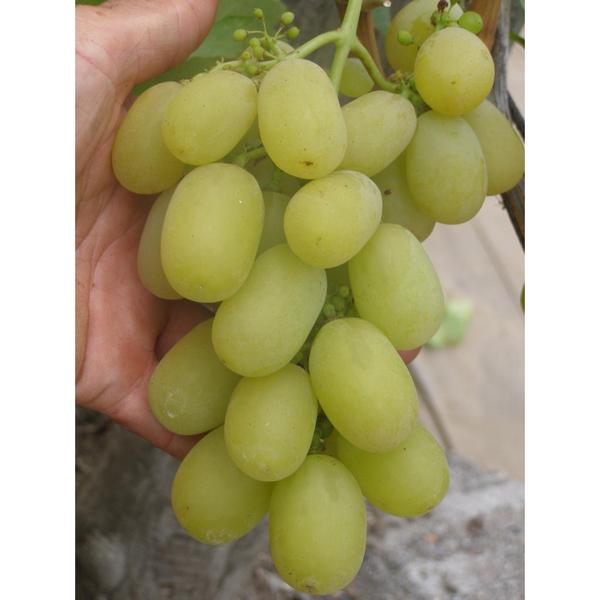 Виноград Золотой дождь (Розалия Х Брестовица) ? столовый виноград среднего срока созревания 115 ? 125 дней. Неповторимый вид и вкус: ягода цилиндрическая с тупым концом (по типу Брестовицы) с плотной хрустящей мякотью, очень сладкая, с цветочно-мускатным привкусом, ягода очень крупная массой 10-15 грамм, белая, цилиндрическая, одна в одну. Грозди пока 600-800 г. Вид и вкус выше всяких похвал. Устойчивость ко многим распространённым болезням средняя, нужно не менее 2-х комплексных профилактических обработок. Морозостойкость на уровне -23.