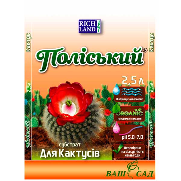 Субстрат "Полесский" для кактусов "Премиум" - готовая к использованию специальная смесь, изготовленная из высококачественного низинного торфа высокой степени разложения с добавлением агроперлита, крупнозернистого речного песка и мелких камней. Максимально приближенный к естественным почвам, обеспечивает аэрацию корневой системы, повышает силу роста растения .