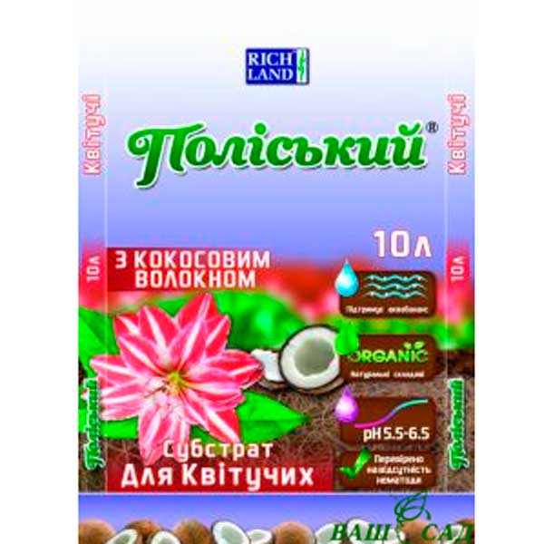 Субстрат "Полесский" - готовая к использованию органическая основа, изготовленная из верхового торфа и высококачественного кокосового волокна, сапонита и мытого речного песка. Сбалансированная формула субстрата с кокосовым волокном стабилизирует грунт, повышает аэрацию корневой системы растения, позволяет адсорбировать излишки влаги и при обезвоживании выравнивает ее баланс в субстрате, повышает необходимую микрофлору растения, обеспечивает великолепие и красочность цветов при цветении растения.