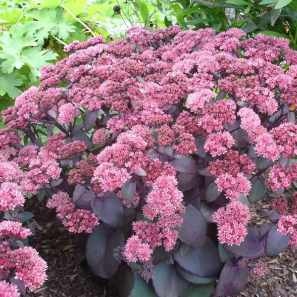 Садовые седумы достигают высоты 80 см, их стебли покрыты толстыми мясистыми листьями зеленого, сероватого, красноватого или темно-бордового цвета с сизым налетом. В июле-августе на конце стеблей седума образуется множество мелких зеленых цветков, которые собраны в широкие горизонтальные или зонтиковидные соцветия. Соцветия у некоторых сортов очитка достигают 30 см в диаметре. К середине-концу лета шапки цветов седума постепенно приобретают более яркий окрас: белый, бледно-лиловый, ярко-розовый, карминный, бордовый и бордово-коричневый. Осенью цветки очитка темнеют, еще долго сохраняясь на растениях и постепенно теряя свою привлекательность.