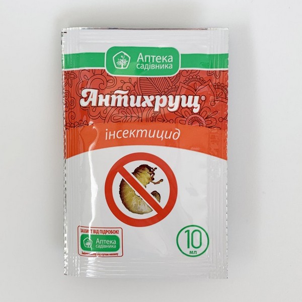 Антихрущ — этот контактно-системный инсектицид обеспечивает решение комплекса проблем защиты от вредителей. Вещества нового поколения контактно-кишечного действия повреждает центральную нервную систему насекомых. Для защиты капусты, томатов, винограда, посевного или посадочного материала от хруща и его личинок, колорадского жука и личинок, клеща, трипсы, плодожорки, долгоносика, гусеницы. Методом внесения в грунт, смачивания корневой системы, обработка в период прорастания. Антихрущ позволяет уничтожить вредителей непосредственно в земле, где происходит основной этап их развития (этап личинки).