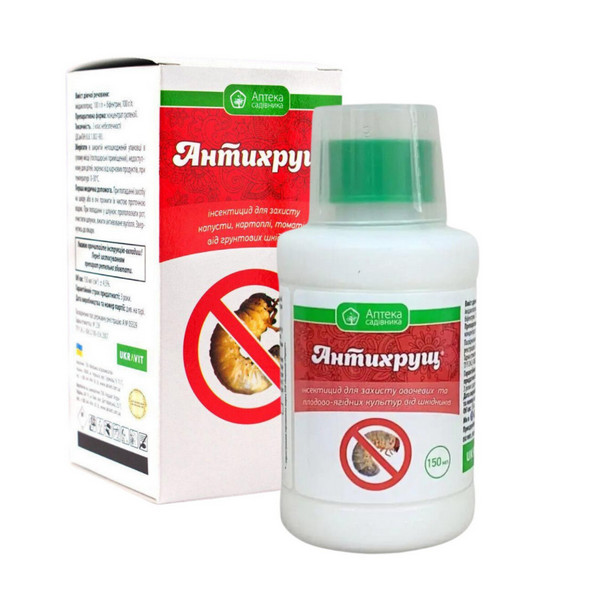 Антихрущ — этот контактно-системный инсектицид обеспечивает решение комплекса проблем защиты от вредителей. Вещества нового поколения контактно-кишечного действия повреждает центральную нервную систему насекомых. Для защиты капусты, томатов, винограда, посевного или посадочного материала от хруща и его личинок, колорадского жука и личинок, клеща, трипсы, плодожорки, долгоносика, гусеницы. Методом внесения в грунт, смачивания корневой системы, обработка в период прорастания. Антихрущ позволяет уничтожить вредителей непосредственно в земле, где происходит основной этап их развития (этап личинки).