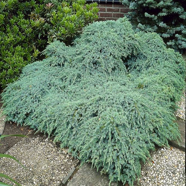 - плоско – распростёртый голубой стелющийся хвойный вечнозелёный кустарник с длинными, часто – расположенными, образующими неправильную подушковидную форму ветвями и слегка наклонёнными вниз концами побегов. В возрасте 10 лет достигает в высоту 0,6 м и в диаметре 2-2,5 м