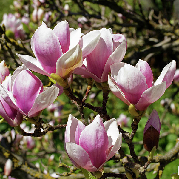 Магнолия суланжа (Magnolia soulangeana) - гибрид, полученный путем опыления магнолии обнаженной и лилиецветной. Это 6-8-метровое дерево с рыхлой кроной, обычно начинающее ветвиться близко от земли. Листья обратнояйцевидные или овальные, заостренные на вершине и у основания, длиной 13-22 см, матово-зеленые, сверху гладкие, снизу опушенные.