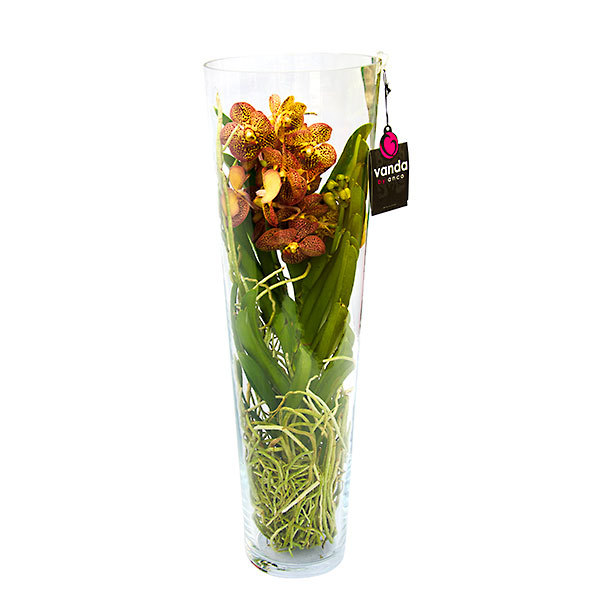 Ванда (Vanda) - это эпифитное растение семейства Орхидные, растущее в природе в тропиках Филиппин, Индонезии, Южного Китая, Индии и Северной Австралии. Отличительной чертой ванды, кроме экзотической красоты, являются ее корни: мощные, серо-зеленого цвета, которые могут впитывать влагу даже из атмосферы, чем защищают корни от обезвоживания и от ожогов солнечных лучей. Стебель орхидеи достигает метра и более в высоту, поэтому ванду с удовольствием выращивают как растение на срезку. Листья у нее ремневидные, кожистые, зеленые или слегка сизоватые, расположенные очередно. На поникающих или прямостоячих цветоносах, растущих из пазух листьев, расцветает от двух до пятнадцати цветков, причем самих цветоносов может быть от одного до четырех. Крупные ароматные цветы ванды всевозможных расцветок (оранжевые, желтые, белые, красные и даже синие), собранные в кистевые соцветия, отличаются тем, что распустившись, они с каждым днем становятся больше в размерах и ярче. Цветение орхидеи длится около полутора месяцев, при правильном уходе цветут они несколько раз в год.