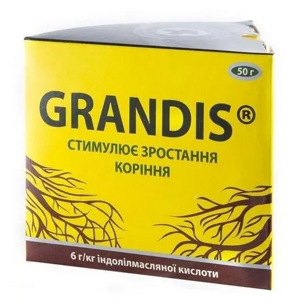 Grandis – препарат, предназначенный для корнеобразования у растений. Созданный на основе индолил-3-масляной кислоты – биологического вещества, стимулирующего формирование корневой ткани. Используется Grandis для припудривания свежих срезов у черенков плодовых, ягодных, цветочных и овощных культур, полива семян.