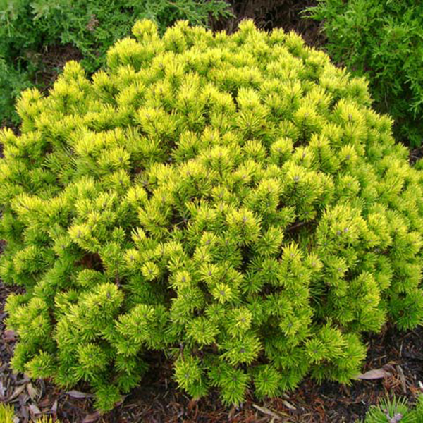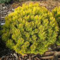 Сосна горная Офир (Pinus mugo Ophir) - хвойный кустарник. Карликовая форма с подушковидной округлой кроной. В десятилетнем возрасте достигает высоты 50 см и до 1 м в диаметре. Хвоя собрана по 2 в пучке, колючая, летом светло-зеленая, со светлыми кончиками. К зиме приобретает характерную золотисто-желтую окраску.