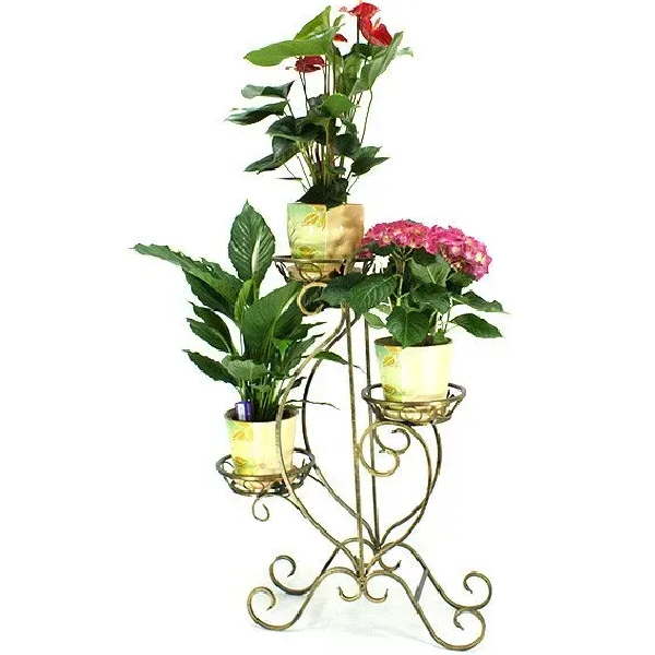 Высота- 110см Ширина- 90см Глубина- 30см. Это недорогая подставка для цветов, которая имеет очень грациозную и изящную форму. Каркас подставки под цветы декорирован вензелями и дугообразными линиями, напоминающими развивающийся парус лодки. Эта кованая подставка для цветов рассчитана на три маленьких вазона (до 30 см), которые размещаются на трех разных уровнях.