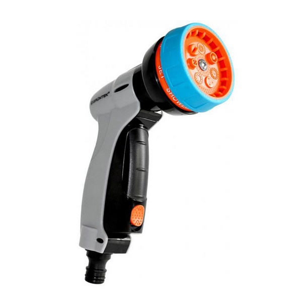 Корпус пистолета изготовлен из прочного многослойного пластика, что обеспечивает долгий срок службы инструмента. Пистолет легко регулирует подачу воды с 7-ю типами струи: от точечной струи до обширного распыления, что позволяет выполнять различные виды работ: от полива до уборки. Есть возможность зафиксировать кнопку включения, что снимает напряжение с руки в процессе полива.