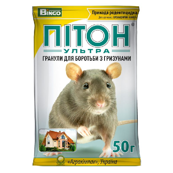 Вещество против всех видов грызунов: крыс, мышей, полевок и т.д. Применяется на территориях населённых пунктов, включая жилые помещения, пищевые, детские и лечебные объекты (в недоступных для детей местах). Препарат экономичен и удобен в использовании. Грызуны, поедая приманку, получают смертельную дозу яда и начинают погибать через 2-4 дня. Окончательный эффект наступает через 2 нед. ПИТОН УЛЬТРА привлекателен для грызунов благодаря пищевым составляющим. Пригоден для использования как в сухих, так и во влажных помещениях (канализационные сети, подвалы, погреба, подземные сооружения).