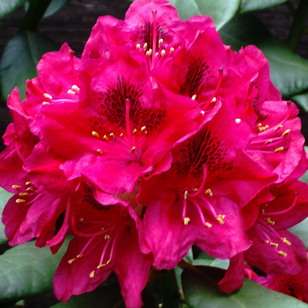 - рододендрон с крупными, рубиново-красными с черным пятном и крапом на верхнем лепестке цветами. Листья крупные, эллипсовидные, кожистые, темно-зеленые сверху и серые снизу. Взрослый кустарник достигает около 2 - 2,5 м в высоту и ширину.