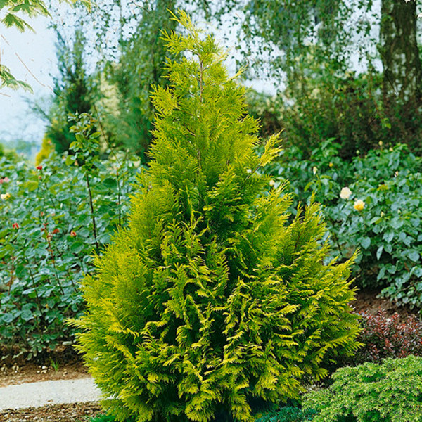 Хвоя: Хвоя чешуевидная, мелкая, блестящая, светло-зеленая, на побегах расположена густо. Молодой прирост окрашен в кремово-желтый цвет.