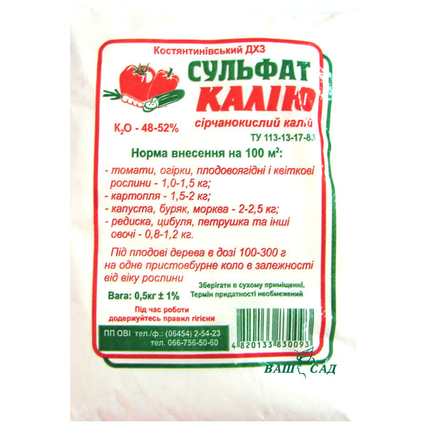 Назначение: Сульфат калия используется для подготовки грунта к зимовке. Калий помогает растениям перенести засухи, сильные морозы и резкие перепады температур, снижает воздействия стрессов и регулирует кислотность грунта. Его рекомендуется применять для улучшения вкусовых и качественных показателей плодов. При регулярном использовании обеспечивается повышение урожая, обеспечивается профилактика различных грибковых заболеваний (в том числе, серая гниль).