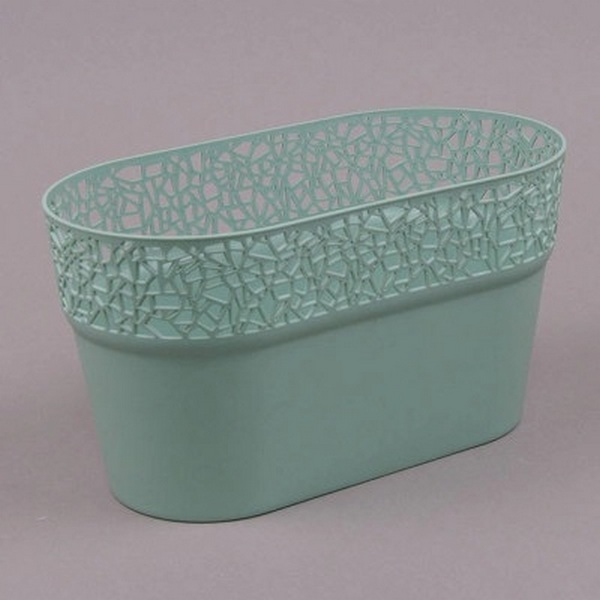 Горшок овальной формы станет прекрасным местом для выращивания рассады, суккулентов, комнатных цветов. Окрас шалфей эффектно оттенит зелень и цветение, которое будет казаться еще ярче. Верхняя часть вазона напоминает кружево, а сам материал легко моется и не выгорает на солнце.