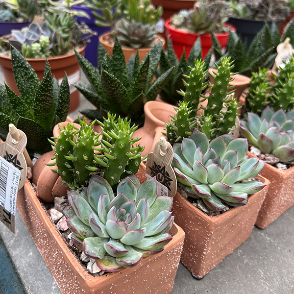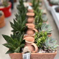 Композиція з кількох видів сукулентів у керамічному горщику з декором.